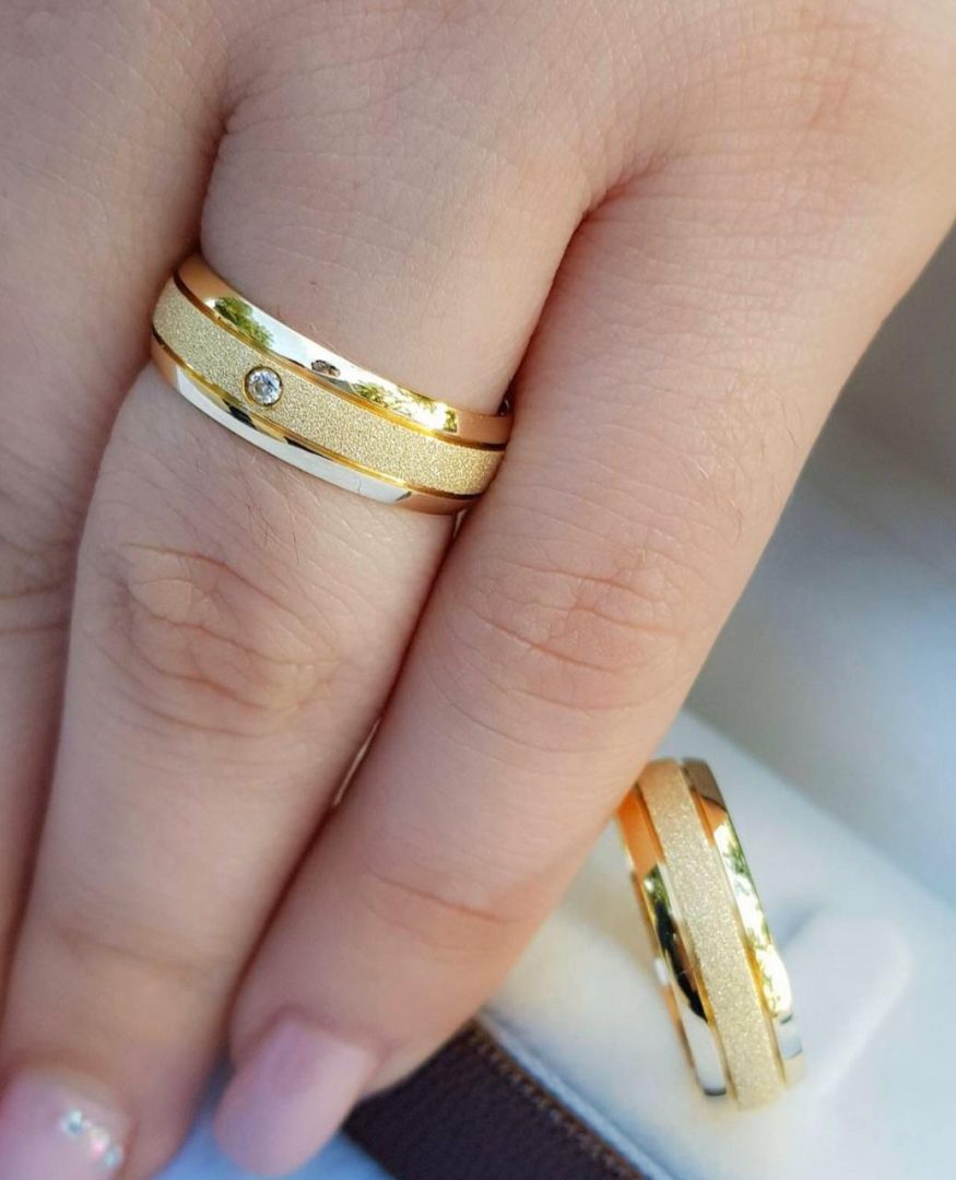 Par de Alianças de Moedas Antiga Abaulada com dois Frisos Aberto Jateado e Pedra