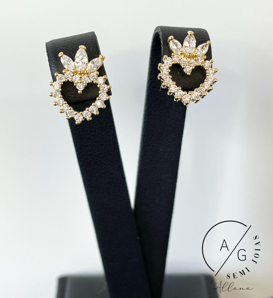 Brinco Coração Coroa Cravejado Banhado Ouro 18K