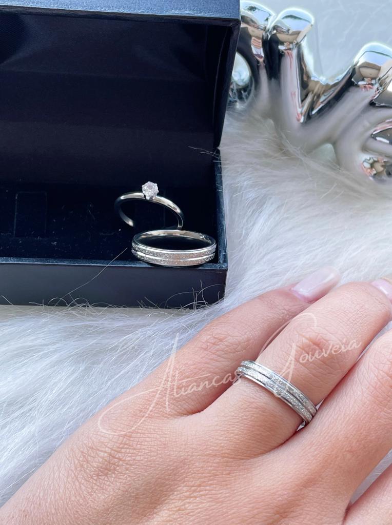 Às alianças são em aço prata (aço inox) não oxida, não descasca e não enferruja. Pode ser usado para todas as atividades do dia a dia normalmente, material é prata por si só, não contém banho, então não existe a possibilidade de alteração de coloração.