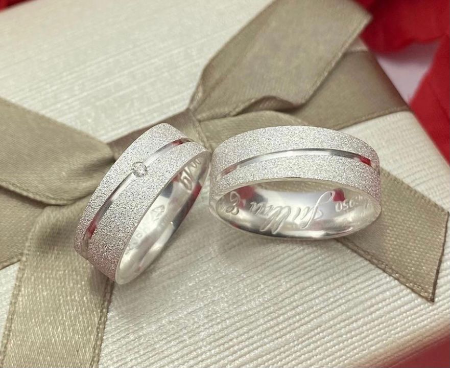 Par de Alianças de Prata 950 – Friso Diagonal e Pedra