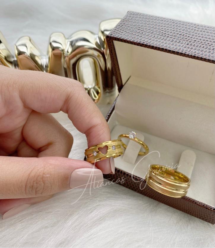 Em até 4x de R$19,75 sem juros À vistaR$75,05no Pix Par de Alianças de Aço Inoxidável Dourada 8MM Coração Vazado e Pedras Escovada